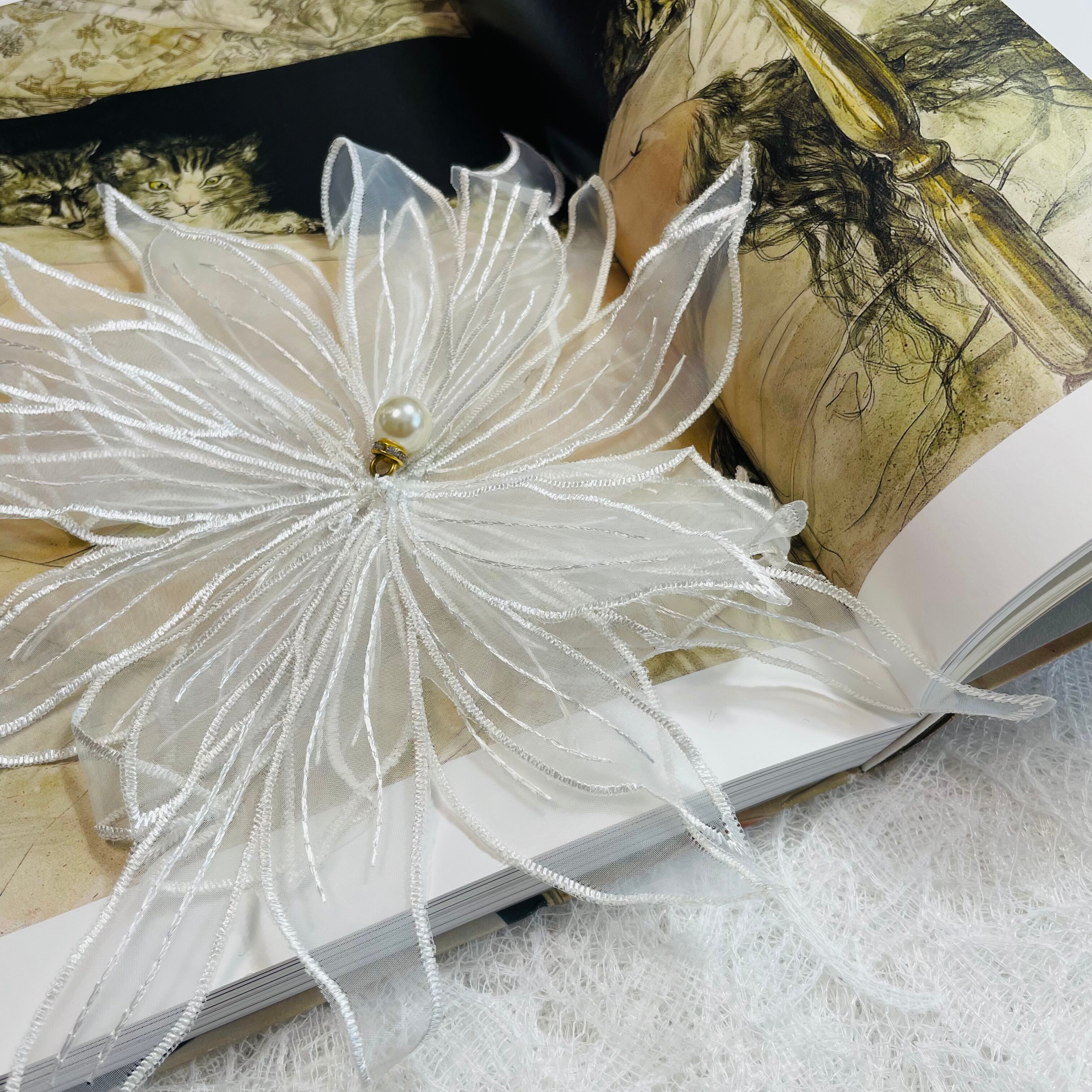 オーガンジーの花びらに刺繍で縁取りをしたものが幾重にも重なり、上品な立体感に仕上がっています。