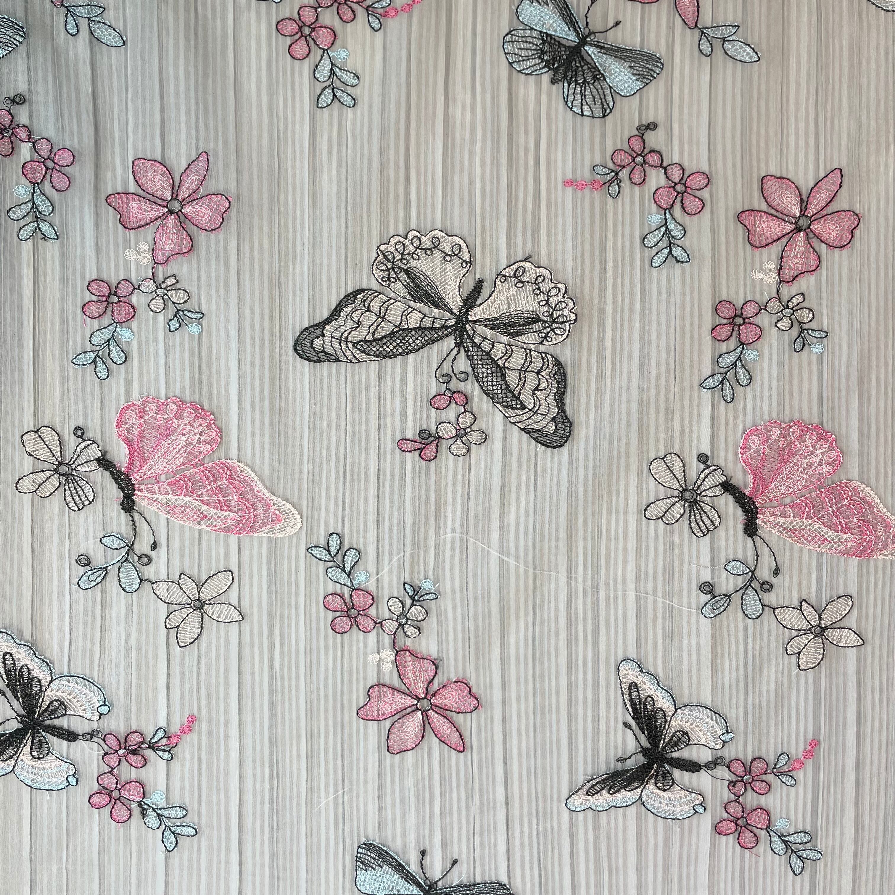 ピンク×ブラック バタフライ柄刺繍生地 約130cm×50cm L2211004