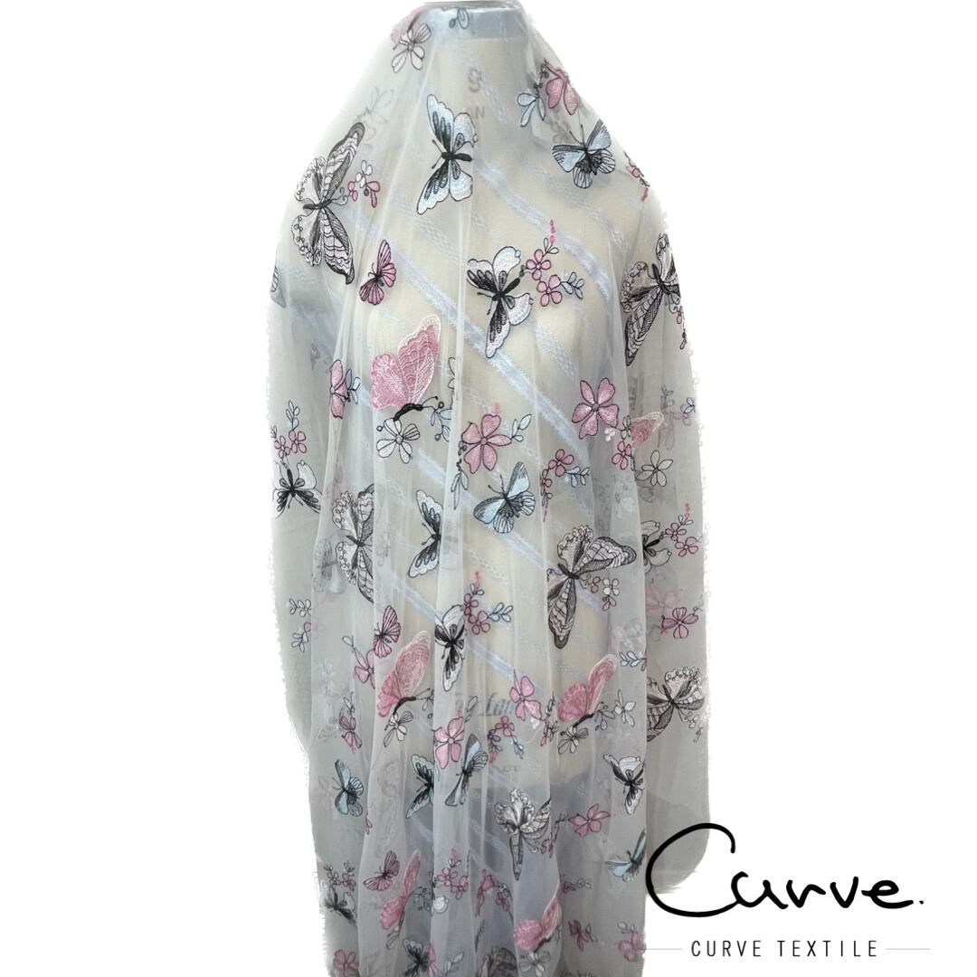 ピンクとブラックのバタフライ柄が個性的な雰囲気のレース生地です。土台は柔らかいチュール生地(淡いピンクベージュ)ですので、スカートや小物など2重使いにしても重くならず扱いやすいです。