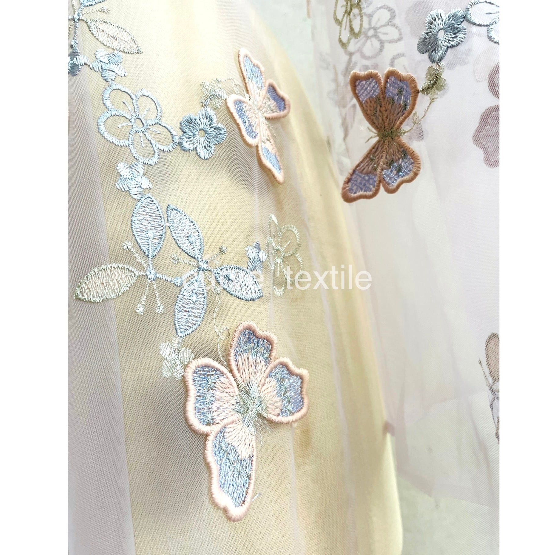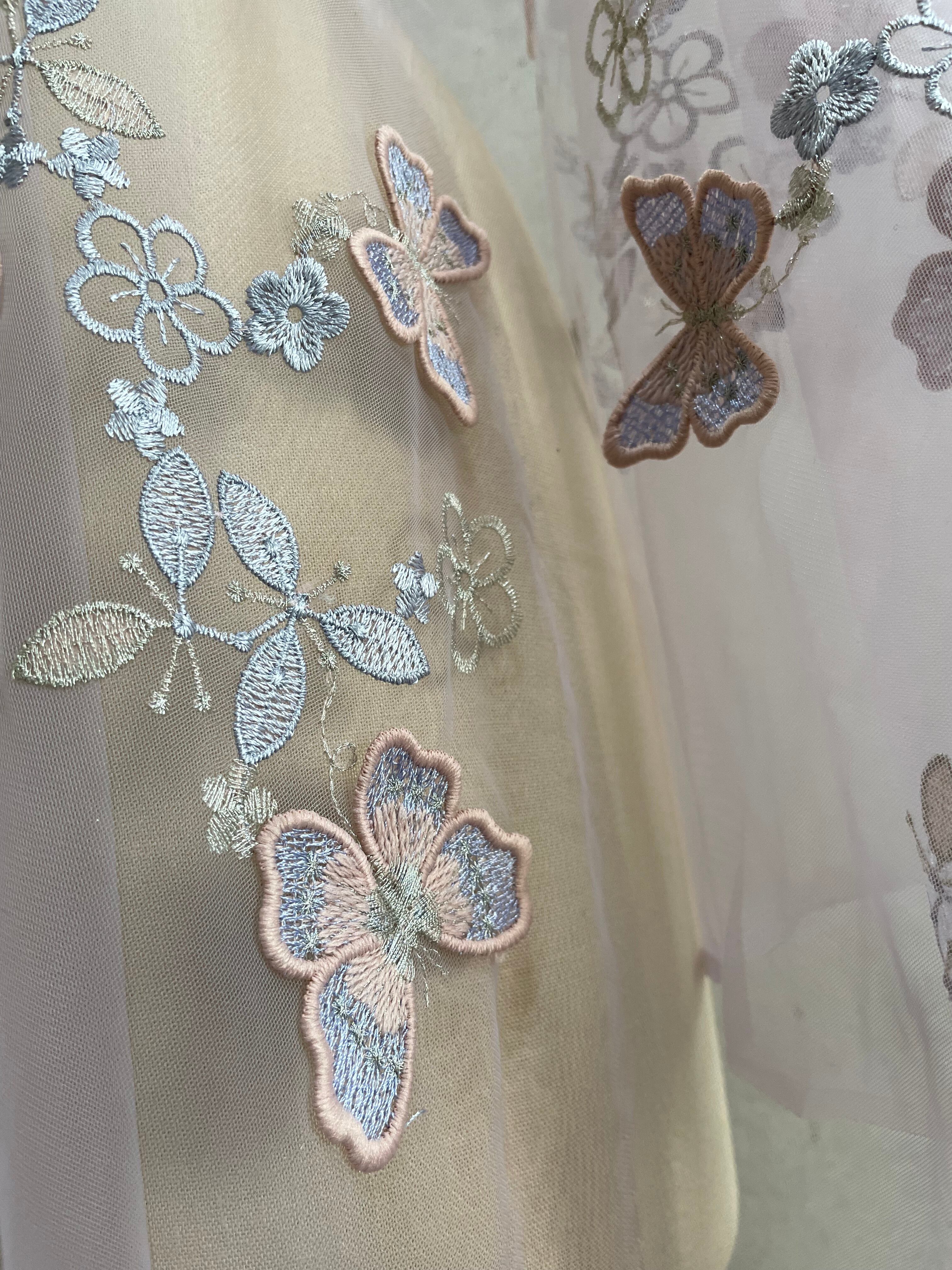 淡いラベンダーの色のチュール生地に可愛らしいバタフライが繊細に刺繍されています。バタフライの端は浮いていますので、立体感がありとても素敵なレースです。